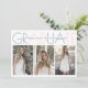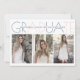 Colagem de fotos de formatura moderna, simples e minimalista para a turma de 2026, com listras azuis poeirentas e rosa choque. Apresenta o texto "Graduate" em azul poeirento e rosa choque e três fotos. A parte traseira apresenta uma foto e um padrão de listras diagonais nas mesmas cores.