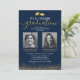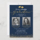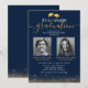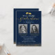Convites de formatura dupla modernos com fundo azul que pode ser alterado para qualquer cor, brilho dourado elegante, boinas, fotos dos dois formandos e um modelo de celebração dupla simples e fácil de personalizar.
