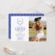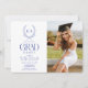 Este convite de festa de formatura chic apresenta um monograma rodeado por uma crista botânica e um arco em azul. O verso apresenta um fundo azul com padrões geométricos. Personalize-o para as suas necessidades. Você pode encontrar produtos correspondentes na minha loja.