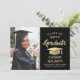 Anuncie um segundo grau ou formandos e convide a família e os amigos a celebrarem com convites de festas personalizados de preto e ouro. A imagem e o texto são simples de personalizar e as cores são fáceis de mudar com a ferramenta design Zazzle. Este modelo para download é configurado como um cartão de lançamento combinado e um convite de festas que pode ser personalizado com qualquer detalhe de sua escolha, como nomes de pais, honras especiais, título de grau, citação inspiracional favorita, planos futuros de formando ou novo endereço. O design apresenta um boné falso de conselho de morteiro de folha de alumínio, uma caligrafia elegante moderna, uma tipografia de vintage clássica e uma foto favorita, como uma fotografia de mais velho ou uma imagem da cerimônia de inicio. Observe que o ouro é impresso a cor, não a folha metálica. Este cartão de graduação imprimível é uma na moda para anunciar uma celebração especial de dia. Parabéns ao formando!