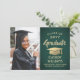 Anuncie um segundo grau ou formandos e convide a família e os amigos a celebrarem com convites de festas personalizados verde-foto e ouro. A imagem e o texto são simples de personalizar e as cores são fáceis de mudar com a ferramenta design Zazzle. Este modelo para download é configurado como um cartão de lançamento combinado e um convite de festas que pode ser personalizado com qualquer detalhe de sua escolha, como nomes de pais, honras especiais, título de grau, citação inspiracional favorita, planos futuros de formando ou novo endereço. A design apresenta um fundo verde-escuro, boné de conselho de morteiro de folha falsa, caligrafia moderna elegante, tipografia de vintage clássica e uma foto favorita, como uma fotografia de mais velho ou uma imagem da cerimônia de inauguração. Observe que o ouro é impresso a cor, não a folha metálica. Este cartão de graduação imprimível é uma na moda para anunciar uma celebração especial de dia. Parabéns ao formando!