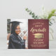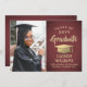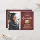 Anuncie um segundo grau ou formandos e convide a família e os amigos a celebrarem com fotos personalizadas de burgundy e convites de festas dourados. A imagem e o texto são simples de personalizar e as cores são fáceis de mudar com a ferramenta design Zazzle. Este modelo para download é configurado como um cartão de lançamento combinado e um convite de festas que pode ser personalizado com qualquer detalhe de sua escolha, como nomes de pais, honras especiais, título de grau, citação inspiracional favorita, planos futuros de formando ou novo endereço. O design apresenta um fundo vermelho-marrom, boné de conselho de morteiro de folha falsa, caligrafia moderna elegante, tipografia de vintage clássica e uma foto favorita, como uma fotografia de mais velho ou uma imagem da cerimônia de inauguração. Observe que o ouro é impresso a cor, não a folha metálica. Este cartão de graduação imprimível é uma na moda para anunciar uma celebração especial de dia. Parabéns ao formando!
