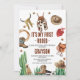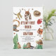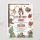 Meninos Foto Western My First Rodeo Cowboy 1rua Invitation Sweet cowboy convite para primeiros aniversarios que pode ser editado para qualquer idade com vários itens temáticos de cowboy e alguns cactos. A foto do seu menino aparece nas costas, junto com algumas botas de cowboy e um chapéu de cowboy.