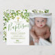 Batismo neutro em relação ao gênero/convites batizantes com um fundo branco clássico que pode ser mudado para qualquer cor, ramos de árvore aquática com folhagem verde esmagadora, uma cruz de ouro religiosa, uma foto de seu filho, e um modelo de texto moderno que é fácil de personalizar.