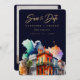 Este convite de casamento apresenta uma pintura aquosa do Quarto Francês, Nova Orleans. É perfeito para um casamento ou evento inspirado em Nova Orleans ou Mardi Gras. - Você pode facilmente alterar ou excluir o texto externo e interno e modificá-lo conforme desejar, clicando em PERSONALIZAR -