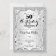 Elegante convite floral feminino de 50 anos com sua foto no final do cartão. Design com falso brilho de prata. Possui listras prateadas, rosas brancas, fonte de script e confetti. Perfeito para uma festa de comemoração de na moda adulto. Personalize com seus próprios detalhes. Pode ser personalizado para qualquer idade! Impressos convites Zazzle ou modelo de impressão digital instantânea para download.