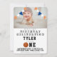 primeiro aniversario Cute Balls Kids Foto de Convite. O cartão tem um tema de basquete - basquete e bandeiras de bundas laranja, azul e branca. A parte traseira da placa é cor de laranja com padrão de faixa branca. Personalize o cartão com a foto da criança e personalize o texto.