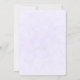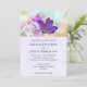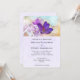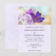 Um convite de casamento com uma bela fotografia de um crocus roxo escuro colocado dentro de uma jarra de vidro. Uma flor roxa clara está presente ao fundo.
