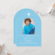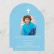 Um fundo azul-céu, decorado com uma cruz branca Personalize e adicione um nome de foto e detalhes. Texto branco. Quadro fotográfico em forma de arco.