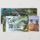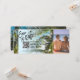 Destino Passagem de Ônibus de Casamento na Praia Bilhete de Passagem Aérea Dourado Salvar a Data com ícone de coração e avião com arte de linha minimalista simples mapa mundial e fundo de praia de palmeiras Adicione sua foto e Código QR