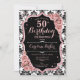 Elegante convite de 50 anos florais com sua foto no fundo do cartão. Design preto e cor-de-vidro com ouro rosa de brilho sujo. Apresenta cor damasco preta e branca, rosas cor-de-rosa pinceladas, fontes de script e confetti. Perfeito para uma festa de comemoração de na moda adulto. Personalize com seus próprios detalhes. Pode ser personalizado para qualquer idade! Impressos convites Zazzle ou modelo de impressão digital instantânea para download.
