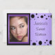 Todos os eventos, celebrações, anúncios e Convites de aniversário. Adequado para todos os aniversários e eventos etários. O Rsvp está disponível sob solicitação em estilo semelhante. Lindos fundos roxos com gradiente Na moda com pontos pretos de tamanho diferente. Moldura Glitter Roxo Metálica com foto. Adicione sua própria foto para personalizar. Alterar estilo e tamanho do texto com personalizar.