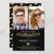 Dobre a comemoração, duplique a diversão! Um elegante convite para a graduação em conjunto com um fundo na moda preto que pode ser mudado para qualquer cor, duas fotos dos formandos, um boné de formatura falho de ouro e um modelo de dupla celebração moderno que é fácil de personalizar.