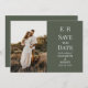 Faça uma impressão duradoura com nossa Foto Moderna do Monograma Oleícola Escuro Salve o Convite de Data. Este design horizontal apresenta a sua foto de forma destacada no lado direito da frente, com o seu monograma e salve os detalhes da data mostrados elegantemente em branco à esquerda, todos colocados contra um sofisticado fundo de azeitona escura. O dorso é um verde-oliva escuro sólido, que proporciona um acabamento elegante e minimalista. Perfeito para casais que querem um toque moderno e pessoal nos seus anúncios de casamento. Totalmente personalizável para ajustado do seu estilo exclusivo.