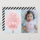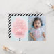 Este belo convite para fotos de primeiro aniversario de "celebrações doces" da garota apresenta um fundo azul claro com um doce de algodão rosa. O verso apresenta um fundo branco com faixas diagonais pretas. Personalize-o para as suas necessidades. Você pode encontrar produtos correspondentes na minha loja.
