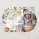Convite para Fotografia de primeiro aniversario Espacial. Divirta-se com este Convite para primeiros aniversarios Espaciais! Perfeito para a primeira viagem do seu pequeno astronauta ao redor do sol, esta design editável apresenta foguetes, planetas, estrelas e um fundo de galáxia. Personalize com os detalhes do seu partido em minutos — ideal para as comemorações do primeiro aniversário com tema espacial. Envie digitalmente ou impressão em casa para um convite fora deste mundo!