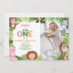 O convite da festa de aniversário Wild One da garota para comemorar seu primeiro aniversario. Tema safari da selva com folhas tropicais de palma, hipopótamo rosa, leão giro, zebra, toucano elefante e macaco. Tenha um aniversário selvagem!