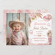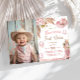 Celebrar um doce "Primeiro Rodeio" com este convite de primeiro aniversario rosa-boho! Apresentando sotaques florais de rosas cor-de-rosa macia e grama pampas, juntamente com toques ocidentais adoráveis como um chapéu cor-de-rosa e botas de vaquinha franzidas, este convite é perfeito para uma celebração de vaqueira boêmica. Ideal para uma festa de aniversário ocidental única e na moda, este convite irá agradar aos convidados com o seu charmoso design.