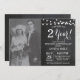 Convite de segundo de aniversário de casamento com foto personalizada. Fundo Chalkboard. Luzes de Corda. Preto e Branco. 1rua, segundo, 3º, 4º, 5, 10º, 15, 20, 25, 35º, 45º, 45º, 50º, 55º, 60º, 65º, 70, 75º, 80, Qualquer Ano. Aniversário Adulto. Mulher ou Festa de aniversário masculina. Para mais personalização, clique no botão "Personalizar" e use nossa ferramenta de design para modificar este modelo.