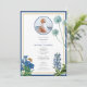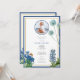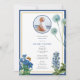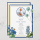 Uma bela design que mostra flores botânicas azuis de cor aquática com sotaques dourados e sua foto de bebê. Um design elegante ideal para o Natal Batismo de um bebê. Papelaria e decoração correspondentes podem ser vistos nesta coleção de designs.