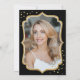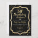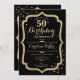 Elegante 50º convite de aniversário com sua foto no fundo do cartão. Design preto de vidro com ouro brilhante falso. Possui fonte de script e confetti. Perfeito para uma festa de comemoração de na moda adulto. Personalize com seus próprios detalhes. Pode ser personalizado para qualquer idade! Impressos convites Zazzle ou modelo de impressão digital instantânea para download.