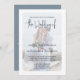 Esta design apresenta uma fotografia minimalista moderna, código QR rsvp via website, digital digitalizável online, um texto elegante azul empoeirado, camada branca de casal de fotografia noivado, uma típica camada simples e romântica de tipografia de caligrafia, estilo vellum de camada de chic, um moderno e simples romântico de elegância, com detalhes de casamento mais informações