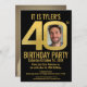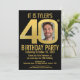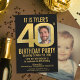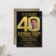Convite de festas de aniversário de 40 anos de modelo de foto em preto gráfico simples e ouro. Personalize este convite de aniversário milestone com seus próprios detalhes de evento de festa de aniversário, e fotos do seu aniversariante ou garota no centro de 0 em 40 e um cheio tirou fotos no verso, excelente para uma oportunidade de fotos e agora. Outras cores de anos e itens correspondentes estão disponíveis. © Original design por Sarah Trett para www.mylittleeden.com no Zazzle.
