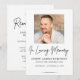 Compartilhe uma homenagem significativa com este convite de memorial de foto moderno em Homenagem. Com um layout limpo e elegante e tipografia de texto refinada, este cartão personalizável oferece uma maneira bonita de convidar familiares e amigos para uma lembrança ou celebração do serviço de vida. Personalize com sua própria foto e detalhes do evento para criar uma lembrança atemporal e sincera.
