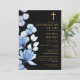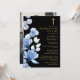 Este convite de celebração de vida e lembrança cristã floral azul elegante preto e dourado pode ser personalizado com suas informações em tipografia clássica e uma foto de seu ente querido no verso. Criado por Thisisnotme©