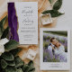 A borda esquerda deste elegante convite de casamento moderno apresenta uma cor d'água roxa, borda agitada, aparada com falso brilho dourado. O texto personalizável combina a escrita manual de cinzas de carvão, as fontes em copperplate e itálico em um fundo branco. Substitua facilmente a imagem de exemplo no verso por sua foto vertical e adicione um texto breve com informações adicionais (como o URL do seu site).