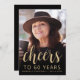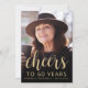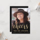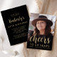 A frente deste 60º convite de aniversário apresenta a foto do convidado de honra com uma camada de texto dourada. A palavra "torcida" aparece num elegante roteiro de caligrafia dourada, seguido de "até 60 anos" e do nome e aniversário do convidado de honra em sans serif font. Uma tela escura ajuda a tornar o texto pop. Personalize o lado inverso com o nome e os detalhes da parte em um plano de fundo preto. Uma forma excelente de celebrar alguém que está fazendo sessenta anos!