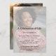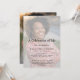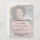 Convite à memória funerária, com uma camada branca, convidando a comemoração do modelo de vida que é fácil de personalizar. Para redimensionar e posicionar suas fotos, clique no botão "PERSONALIZAR TI".