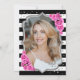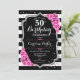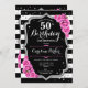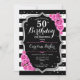 Elegante convite floral feminino de 50 anos com sua foto no final do cartão. Design cor-de-rosa preto-claro com prata brilhante. Apresenta faixas pretas e brancas, rosas cor-de-rosa, fontes de script e confetti. Perfeito para uma festa de comemoração de na moda adulto. Personalize com seus próprios detalhes. Pode ser personalizado para qualquer idade! Impressos convites Zazzle ou modelo de impressão digital instantânea para download.