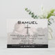 Convide amigos e familiares para celebrar a dedicação especial do seu filho com esses convites de foto de bebê preto e branco modernos. O design minimalista apresenta uma cruz simples com o nome do seu filho/filha—acompanhado pelos detalhes da sua cerimônia e celebração. Cartões de dedicação de bebê. Sobreposição de filtro branco para fazer a foto desaparecer no fundo.