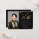 Foto Preta e Dourada 50º Convite de festas Surpresa de Aniversário. Esse design abraça um tema negro e ouro minimalista que expele elegância moderna. O convite apresenta um fundo preto elegante, proporcionando uma canvas sofisticada para os sotaques de ouro opulentes. A tipografia moderna e na moda toma o palco central, com fontes serif, criando um olhar impressionante e elegante. O layout é limpo e desorganizado, destacando detalhes importantes como data, hora e local do evento em um formato elegante e legível. Este design minimalista preto e ouro garante um convite chic e refinado que dá o tom para uma inesquecível celebração de aniversário de marcos.