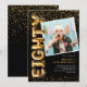 Convite de aniversário de 80 anos moderno com fundo preto elegante, modelo de foto para substituir com a sua, dispersão de confetes dourados, balões de hélio dourados que formam a palavra "oitenta", e modelo de texto de festa elegante e fácil de personalizar.