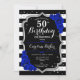 Elegante convite floral feminino de 50 anos com sua foto no final do cartão. Design azul real branco preto-claro com cinza azul escura. Apresenta faixas pretas e brancas, rosas azuis safiras, fontes de script e confetti. Perfeito para uma festa de comemoração de na moda adulto. Personalize com seus próprios detalhes. Pode ser personalizado para qualquer idade! Impressos convites Zazzle ou modelo de impressão digital instantânea para download.