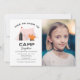 Um cartão de modelo de convite de aniversário para acampar ao ar livre para crianças com uma tenda cor-de-rosa com uma fogueira ao lado. O texto acima diz "caminhe por cima". Você também pode adicionar a foto do seu filho ao lado das informações da festa.