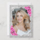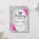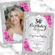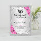 Elegante convite floral feminino de 50 anos com sua foto no final do cartão. Design com falso brilho de prata. Possui listras prateadas, rosas cor-de-rosa, fonte de script e confetti. Perfeito para uma festa de comemoração de na moda adulto. Personalize com seus próprios detalhes. Pode ser personalizado para qualquer idade! Impressos convites Zazzle ou modelo de impressão digital instantânea para download.