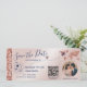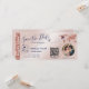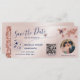Bilhete de Passagem de Embarque de Praia de Destino Plano Dourado Salve a Data com o ícone do coração e do plano com o mapa do mundo do rosa dourado de brilho. Adicionar sua foto e código qr