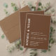 Este convite apresenta um fundo castanho-escuro com um design minimalista. Os nomes do casal são destacados em tipografia ousada e elegante, acrescentando um toque de elegância moderna ao convite. Adicione sua foto atrás.