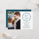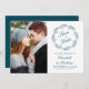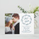 Esta elegante foto salva o cartão de data apresenta uma faixa de folhagem de linha azul teal que rodeia as palavras "Salvar a Data" em um roteiro clássico. Substitua facilmente a imagem de amostra por uma foto de vocês dois. Personalize o texto restante com seus nomes e data e local do casamento. O verso é azul-marinho sólido.