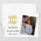 Anúncio de noivado simples moderno com sotaques dourados. Imã salve o dia únicas para enviar para a família e amigos. Casamento de férias em Paris (adicione seu destino). Adicione a sua dentro de fotografia a este design de fotografia mascarada. Você pode mudar o texto. Opção de download para compartilhar em suas sociedades.