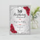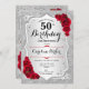 Elegante convite floral feminino de 50 anos com sua foto no final do cartão. Design com falso brilho de prata. Possui faixas prateadas, rosas vermelhas, fontes de script e confetti. Perfeito para uma festa de comemoração de na moda adulto. Personalize com seus próprios detalhes. Pode ser personalizado para qualquer idade! Impressos convites Zazzle ou modelo de impressão digital instantânea para download.