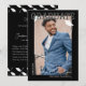 Comemore as conquistas de seu formando com este convite para a graduação em preto-e-branco. Apresentando um título de "FORMANDO" ousado com um gráfico de boné de formatura, este design mostra uma foto personalizada do formando na frente. O verso do convite inclui detalhes essenciais de eventos com tipografia elegante, complementada por um padrão repetitivo de boné de formatura para um toque festivo. Ideal para segundo grau ou formandos, este modelo é totalmente personalizável para corresponder ao estilo do seu formando.
