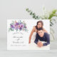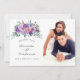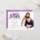 Cartões de fotografia de agradecimento do casamento com flores roxas em um buquê pintado à mão, projetados para serem personalizados rápida e facilmente para o seu dia especial.