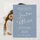 Convite de Casamento com Caligrafia de Letra Simples Moderna - apresenta os nomes da Noiva e do Noivo, grandes e em negrito, em tipografia moderna e manuscrita. O verso do convite apresenta uma bela foto da noiva e do noivo. O convite fará parte de um conjunto de casamento e estará disponível em várias cores. Você pode facilmente alterar a cor do fundo para combinar com o tema do seu casamento. Mostrado em azul poeirento.