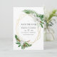 Convite de casamento com folhas tropicais em aquarela e magnólias brancas com moldura geométrica em ouro.