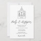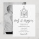 Design encantador de “ida à capela” com uma capela de casamento desenhada à mão em preto e branco. Ideal para conjuntos de noiva minimalistas românticos, papelaria de casamento e celebrações inspiradas em coquette.