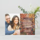 Convites de casamento ao ar livre no outono, apresentando uma romântica floresta de outono, luzes cintilantes, uma foto dos futuros sr. e sra., e as informações do seu casamento escritas em um letreiro de madeira rústico.
